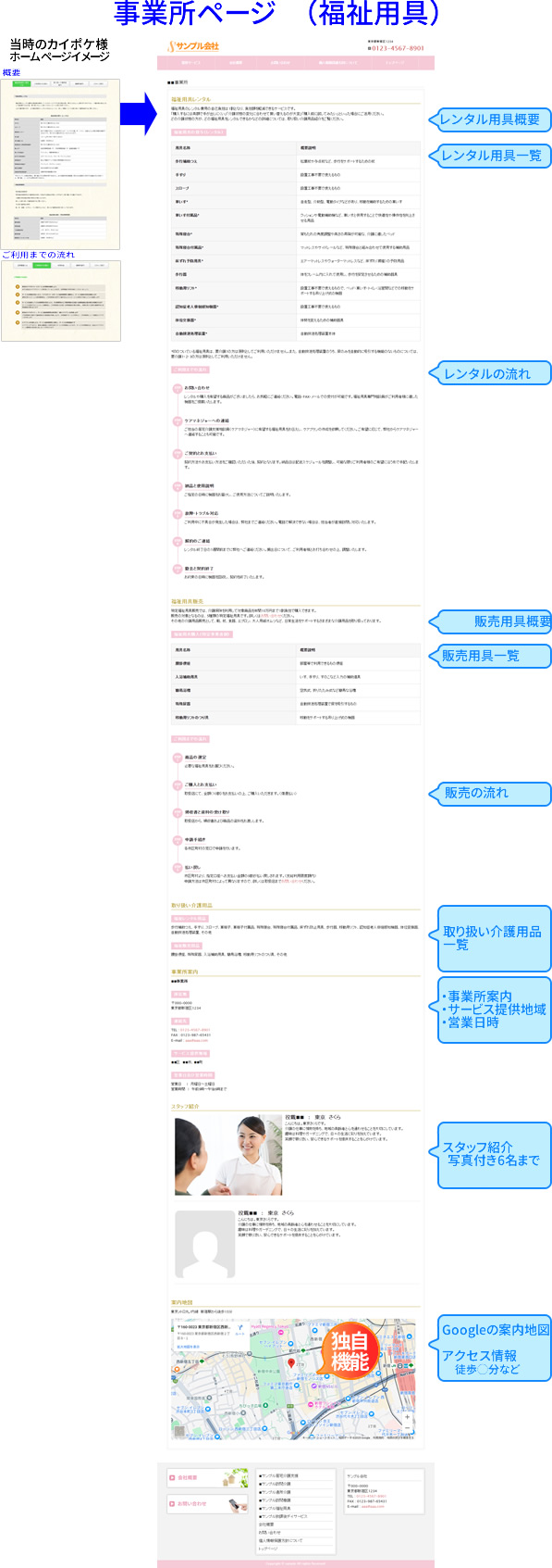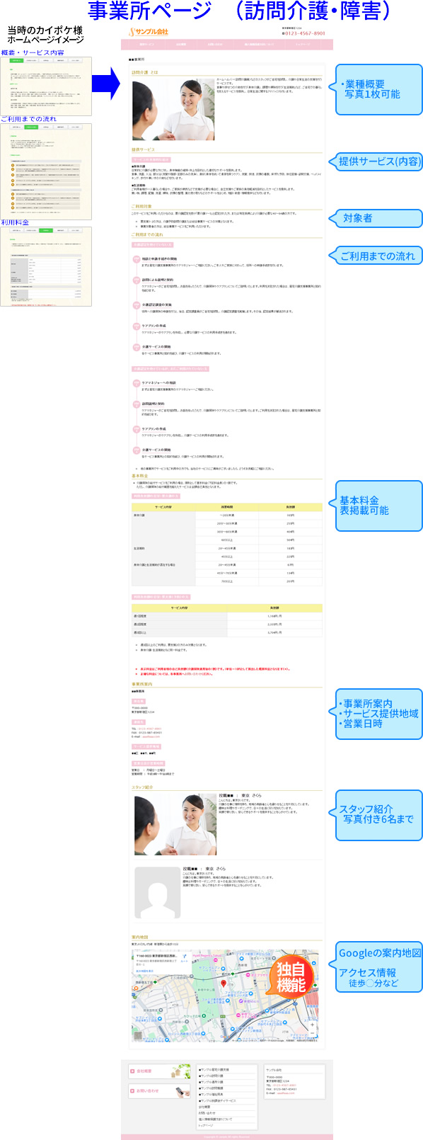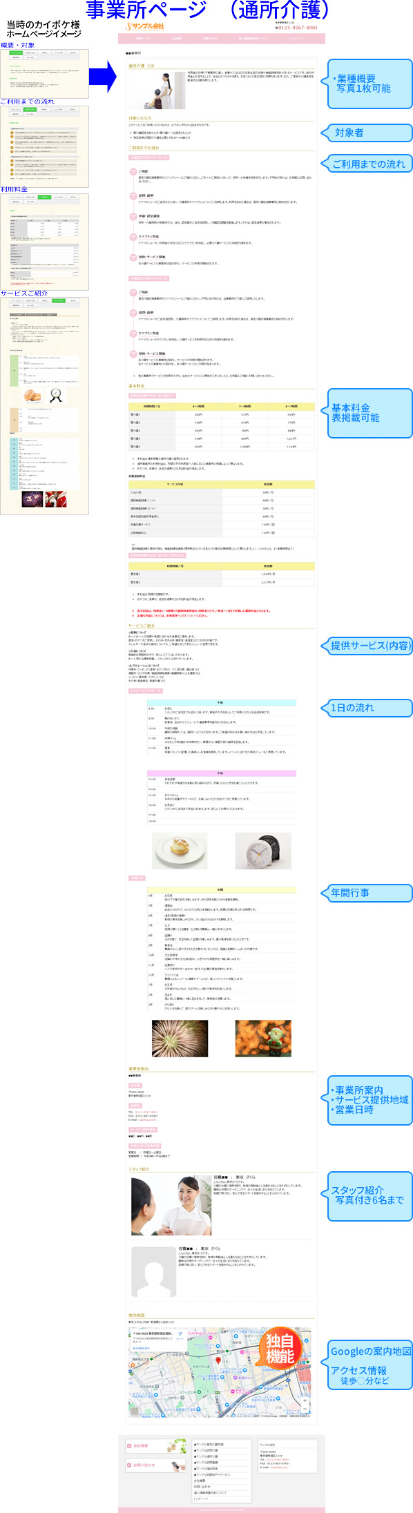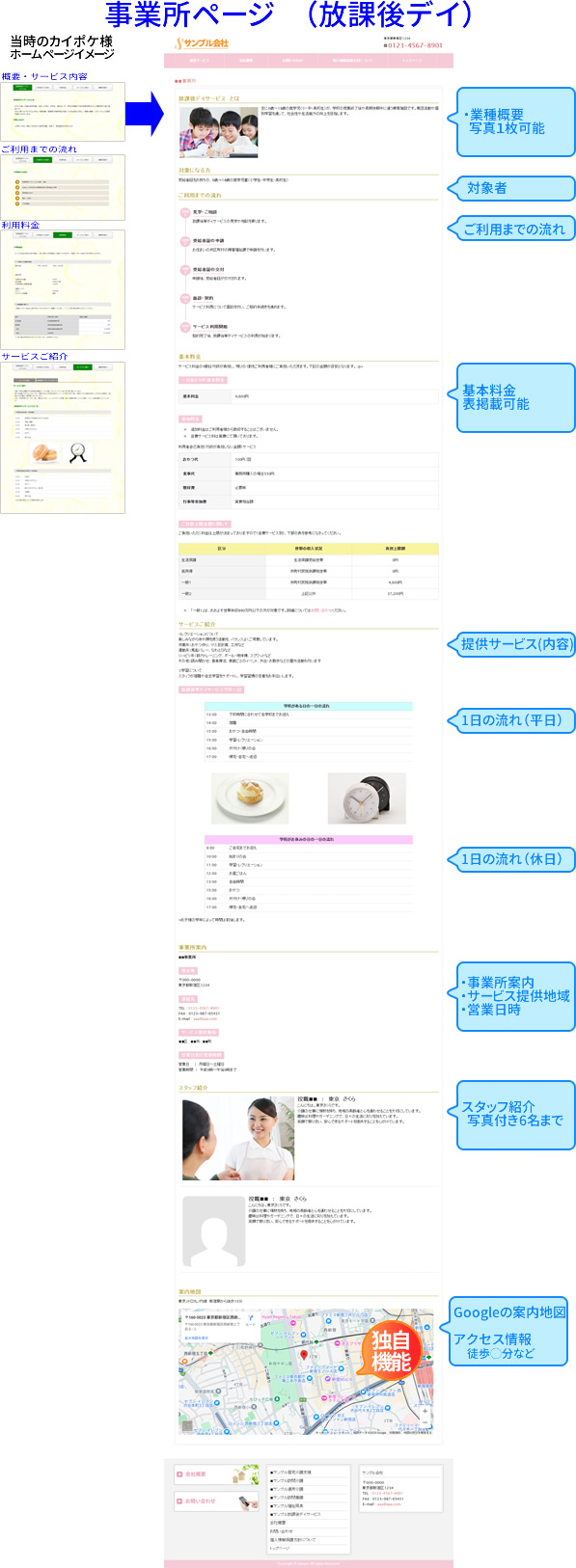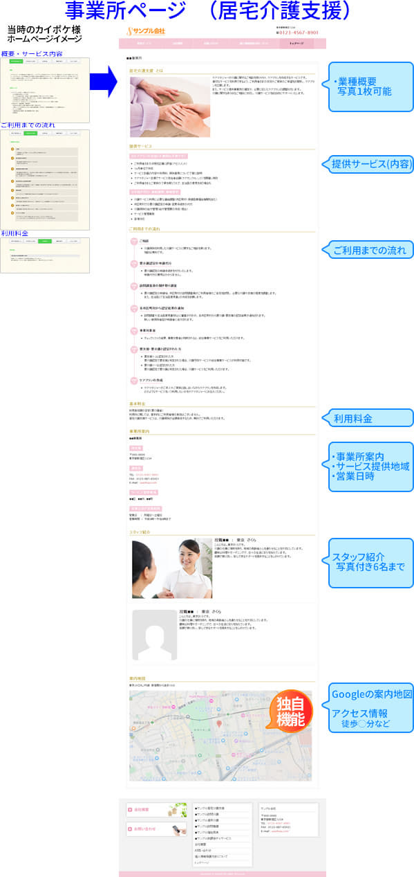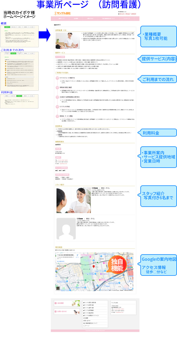 更に現在カイポケ様のホームページが見れなくなっていますが、法人紹介のページだけでなく、当社独自のフォーマットで貴社のサービス事業用の事業内容紹介ページも作ることが出来ます!